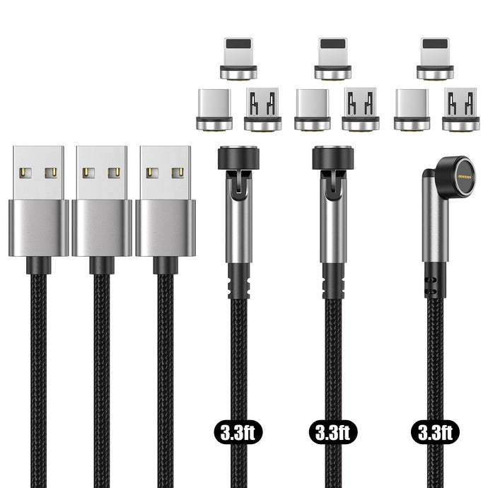NetDot 3in1 Gen12 Magnetic Fast Charging Data Transfer Cable compatible with Micro USB & USB-C smartphones and iPhone [3.3/5/6.6ft,1/1.5/2m,3 pack black]